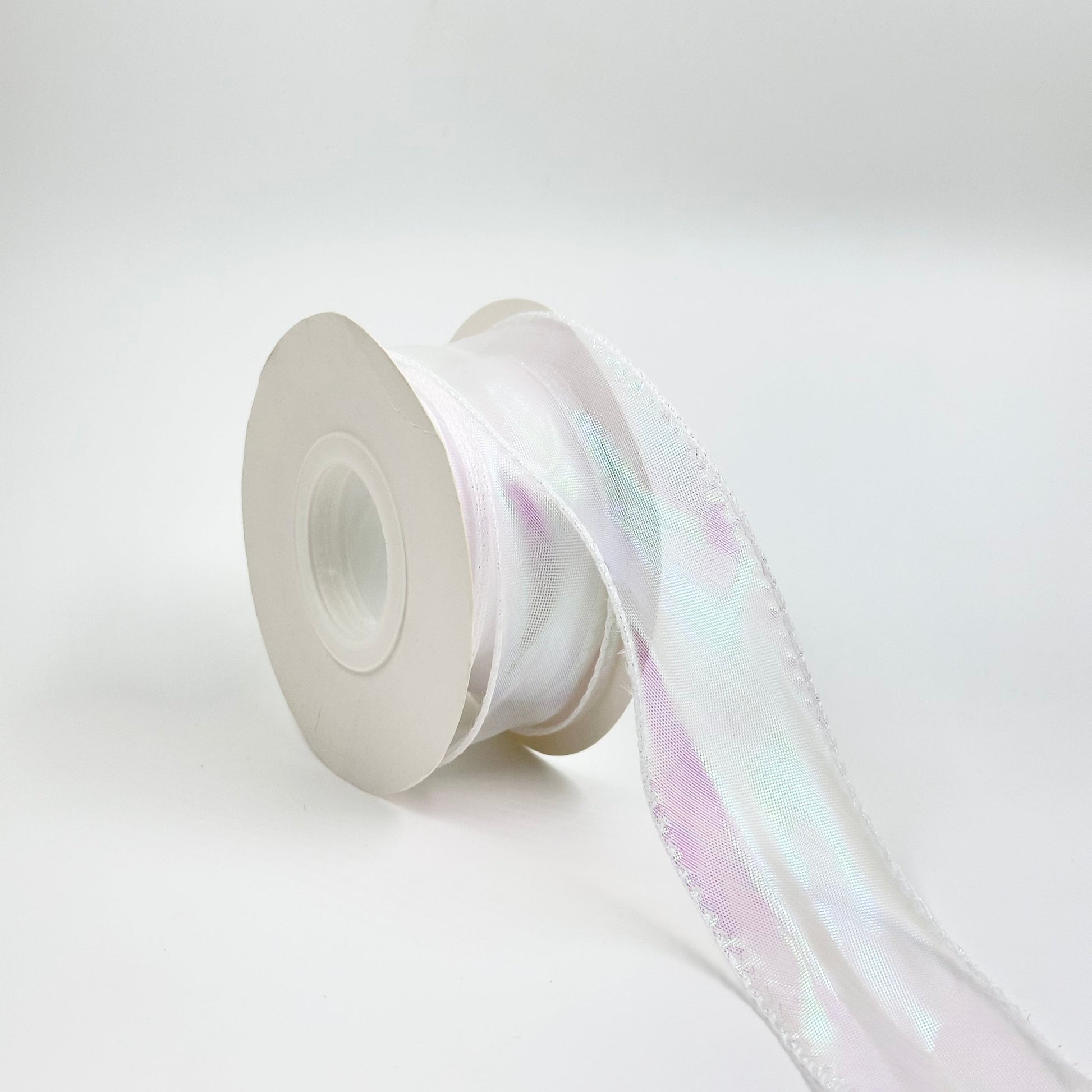 Lightweight organza ribbon with a subtle iridescent sheen and fishtail edging. The transparent finish reflects multiple colors under light, giving it a decorative shimmer. Suitable for gift wrapping, floral arrangements, event décor, and craft applications.