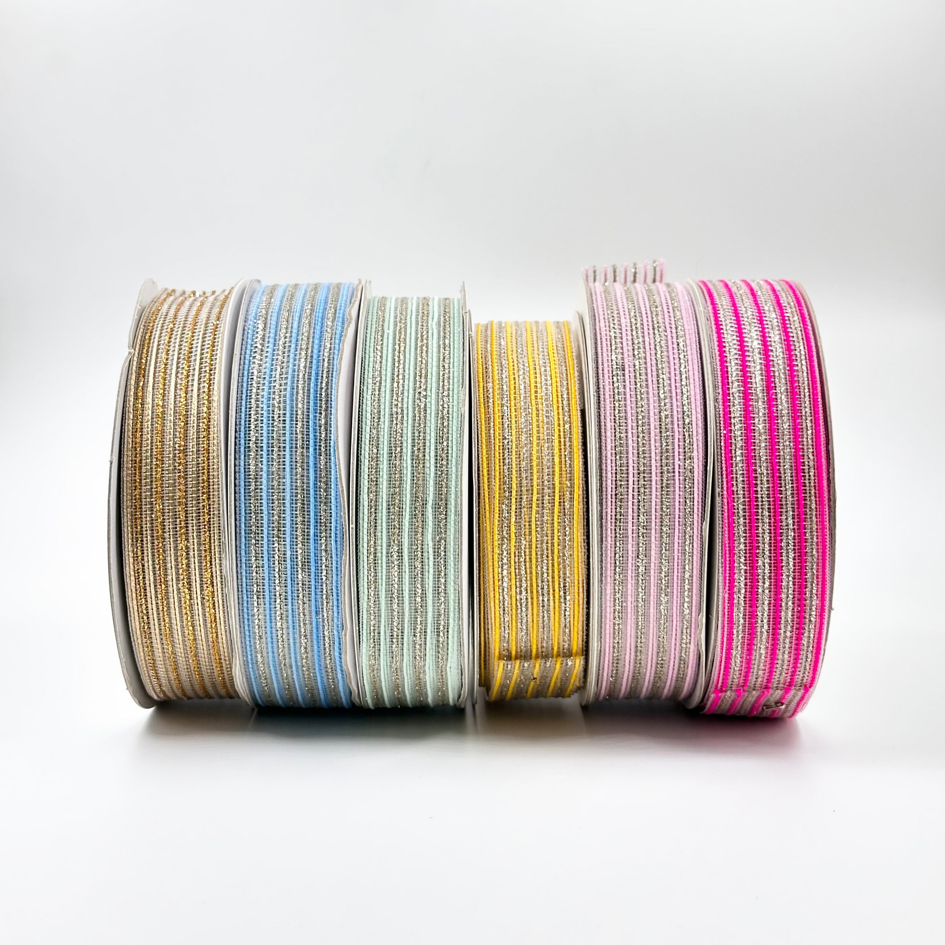 our Metallic Woven Striped Ribbon. Crafted with a soft, semi-sheer polyester base and accented by brilliant metallic threads, this ribbon offers both flexibility and structure for effortless styling. The evenly spaced horizontal stripes create a dynamic visual texture, perfect for elevating your seasonal décor, gift wrapping, and event embellishments.