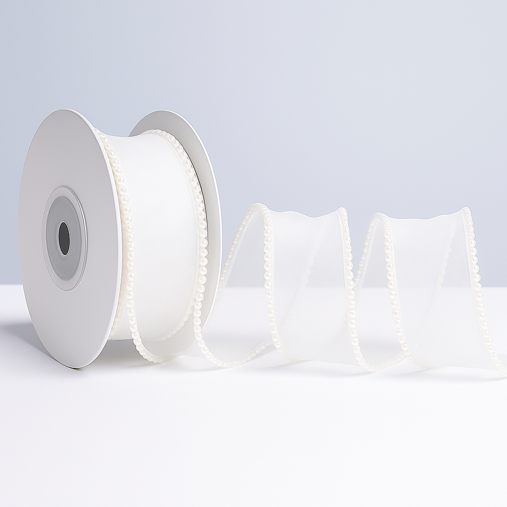 Pearl-edged sheer ribbon with a delicate sheer finish and subtle pearl trim. ideal for elegant gifting and decor.